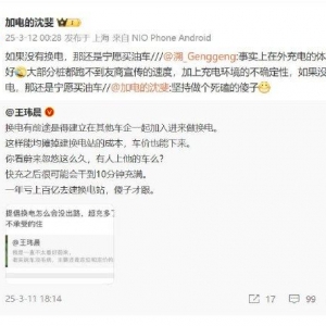 微博博主质疑蔚来换电路线,认为需要其他车企加入分担成本。蔚来高管怒怼称坚持做死磕的傻子,表示无换电宁愿买油车。