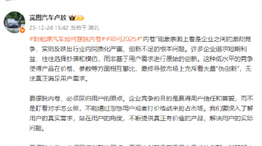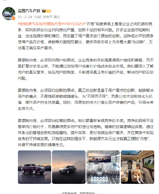 凤凰网科技讯 12月24日,岚图汽车CEO卢放在微博发长文,针对新能源汽车行业“内卷”现